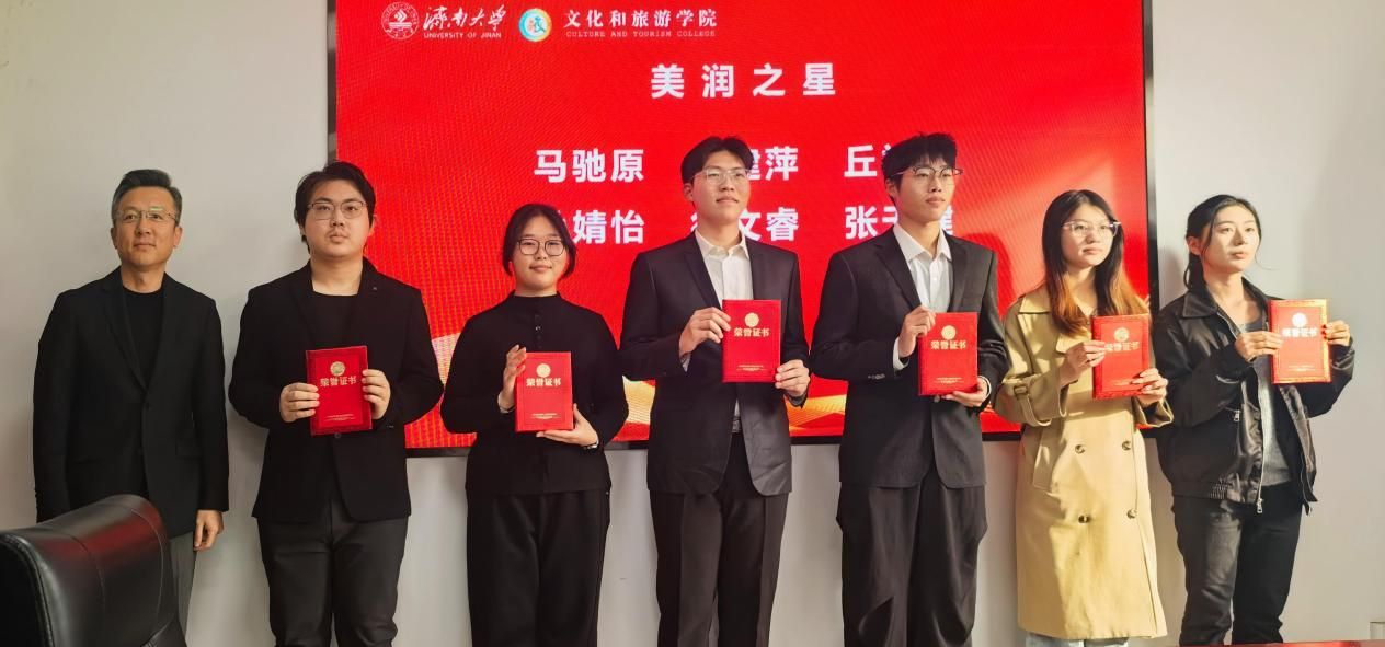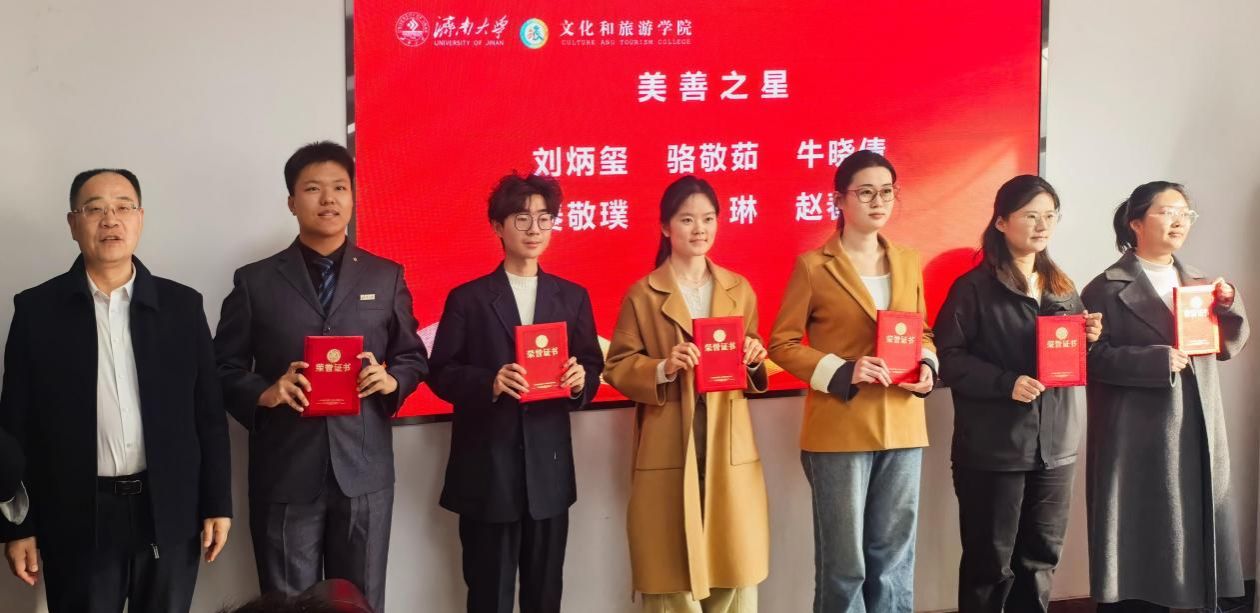 在随后进行的表彰仪式上,信苏珊宣读了《太阳成集团tyc122ccvip首届“四美之星”表彰决定》。学校党委常委、宣传部部长卢旺,学校学生工作处处长胡春毅,学校团委书记李书翔,学院副院长马修伦分别为“美思之星”“美润之星”“美创之星”“美善之星”获奖学生代表颁奖。获奖学生代表刘炳玺同学上台发言,分享了其在美育熏陶下成长的心得体会,表达了对学校、学院培养的感激之情以及继续砥砺前行的决心。