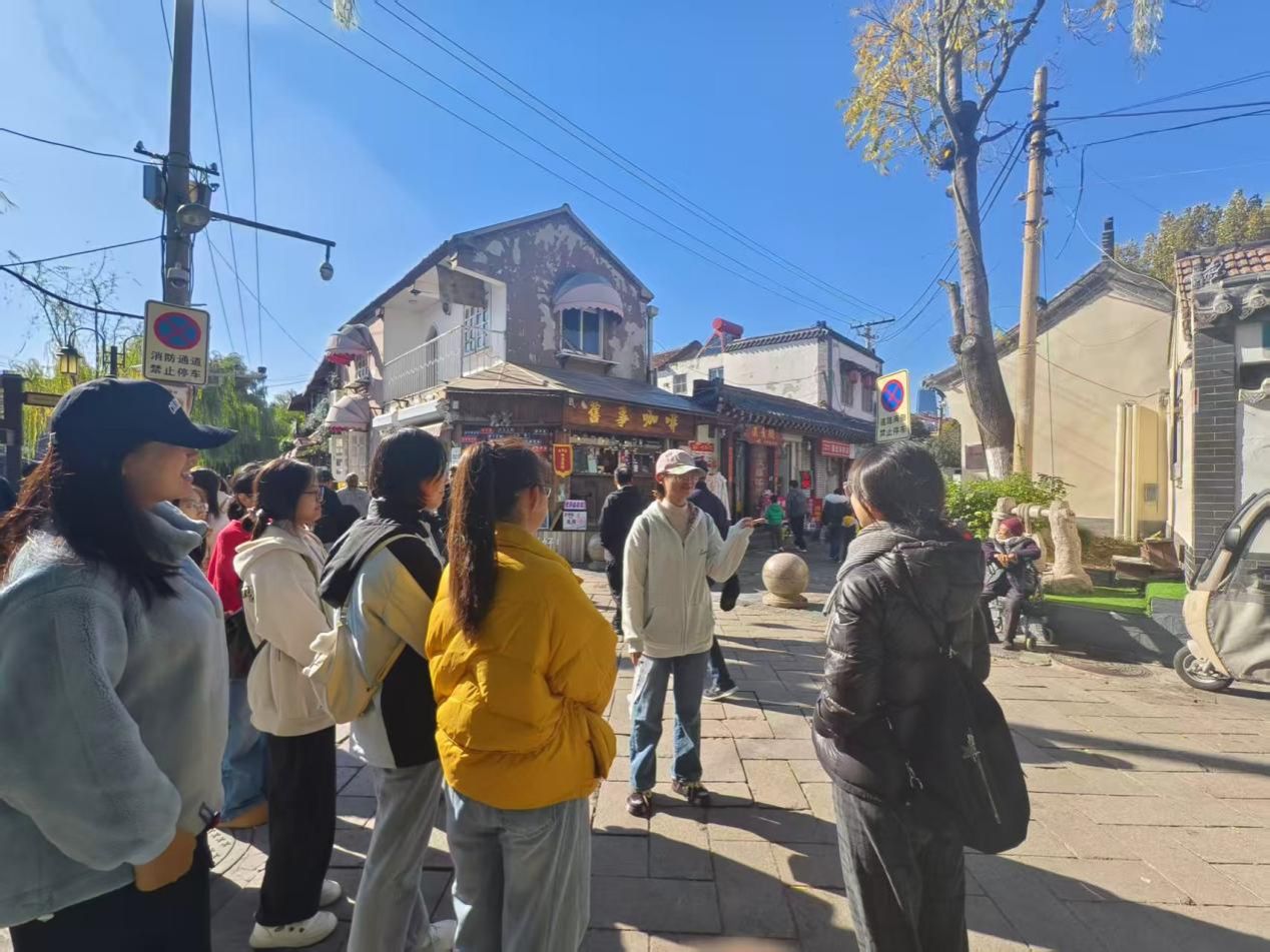 曲水亭街是本次研学活动的最后一站,也是本次活动中最具“泉城烟火气”的一站。结合朱自清散文中“济南最像江南的地方”的描述,大家在石板路上寻找“家家泉水,户户垂杨”的景致——脚边石缝渗出的清泉、青砖老院里保留的“曲水流觞”旧址,都让文字中的“江南韵味”有了具体模样。师生们还走进泉水豆腐店,品尝《老济南街巷志》中记载的“泉水豆腐”,并与街边老住户亲切交流,听他们讲述“小时候在泉边玩耍”的往事。