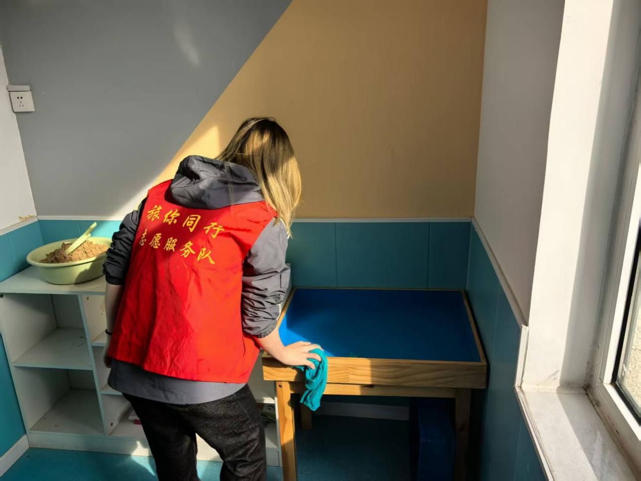 公共设施的清洁聚焦高频接触部位,志愿者们手持消毒湿巾,逐一擦拭活动室门把手、窗台、储物柜拉手及玩具架边缘。面对频繁触碰的门把手,反复擦拭确保消毒彻底;遇上窗台上的顽固污渍,便用温水浸湿抹布耐心清理,让每一处设施都洁净光亮,为孩子们筑牢健康防线。
