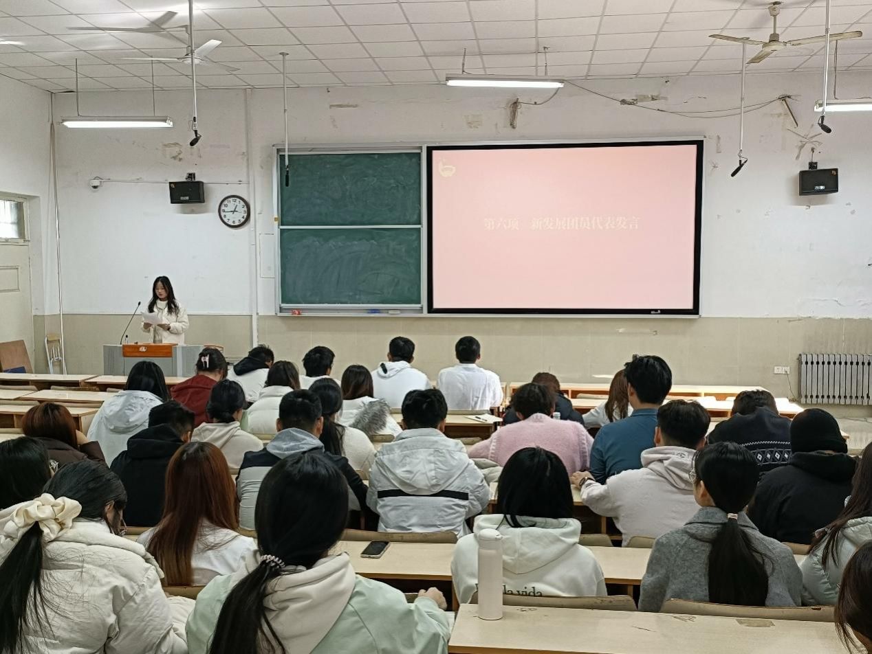 仪式上,优秀团员代表李雨薇以自身入团经历开篇,阐释“团员”的重量——团徽是“奉献、担当、责任”的标尺。她谈到,团员要读懂团旗里的青春信仰,把入团誓词落于日常行动,在集体中携手成长。最后,她号召新团员以“向上、向善、向远”绘就青春,以实干践行“合格共青团员”的承诺。新发展团员代表韩雨轩表示,在佩戴团徽、宣誓的时刻,自己深刻体会到“团员”的使命重量。她代表新团员承诺:将以更高标准要求自己——思想上锚定理想信念,学习中勤学善思强本领,纪律上严于律己树形象,集体里主动奉献传温暖。她号召新团员以奋斗践行入团初心,以行动为团组织增光添彩,与青春同向、与时代同行,表达出了以团员标准严格要求自我、在专业学习与集体建设中发挥先锋作用的决心。