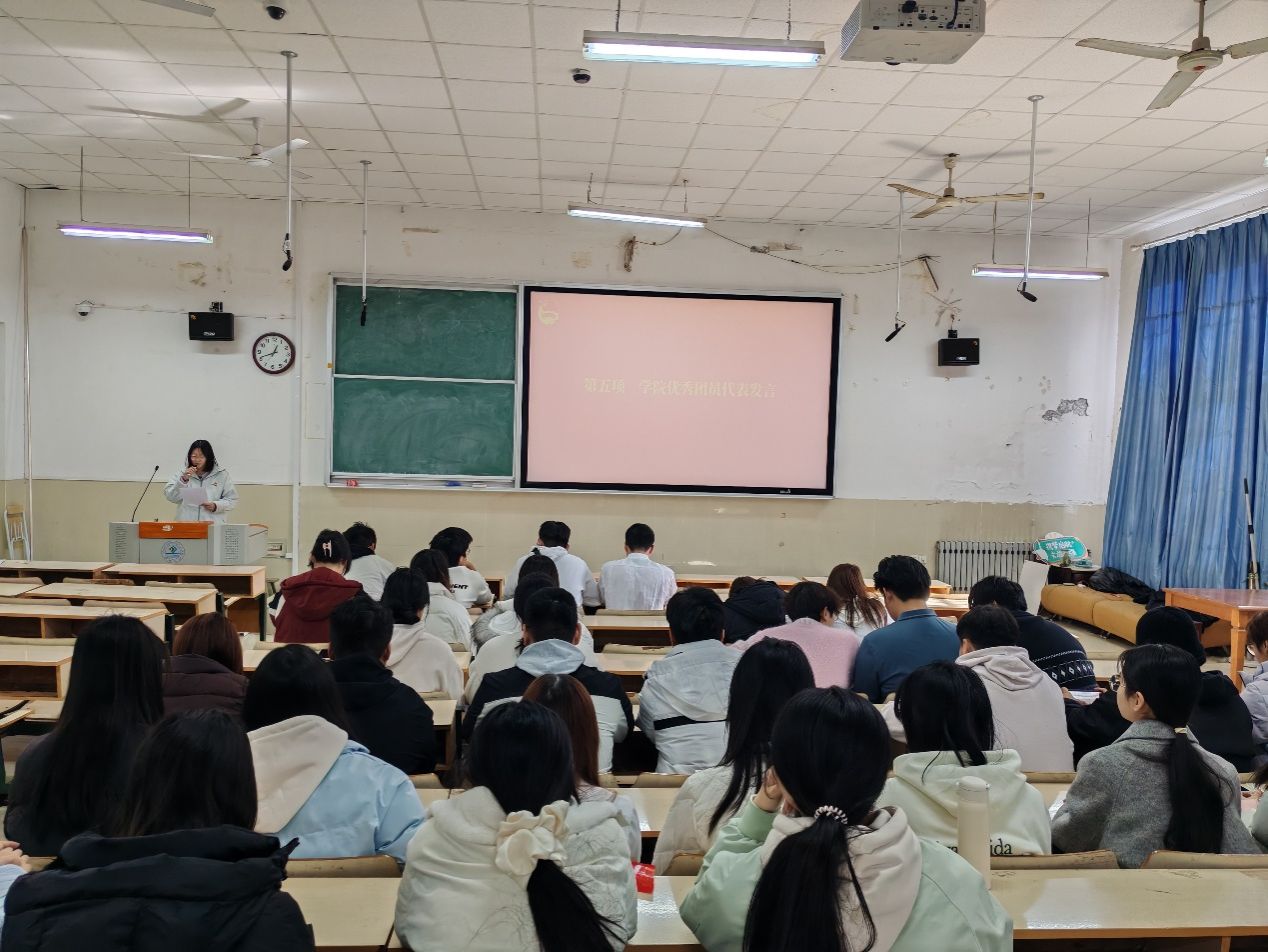 随后,学院团委书记赵军讲话。他指出,经济领域有“先富带动后富”,思想领域则需“先进引领后进”,团员正是凝聚青年思想的先进力量——从当年穿着破旧衣物研发战机的罗阳,到如今攻关航天、军工领域的青年团队,国家发展始终需要有理想的青年作为中流砥柱。他强调,入团不是小事,而是选择了指导思想与政治立场,“思想”这颗种子会潜移默化影响个人的未来职业与人生选择,让个人奋斗与国家发展同频共振。他勉励新团员以入团为里程碑,在思想上不松懈,在生活中勇担责任,在实干中锤炼自我,让青春与时代同行。