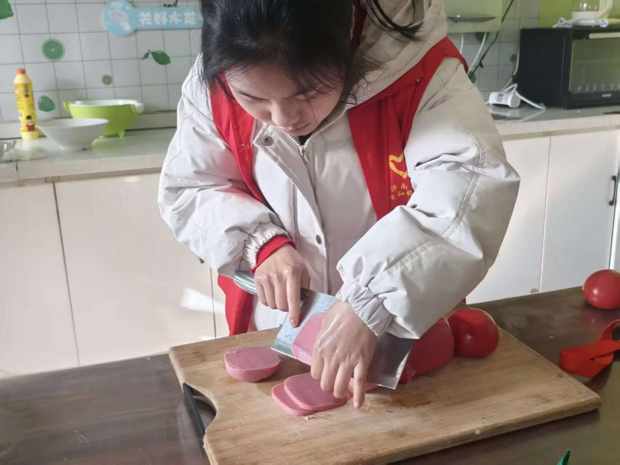 目光流转间,志愿服务的暖意漫进了厨房。志愿者化身温柔的“小老师”,立于砧板旁,将切菜的动作缓缓放慢,每一个动作都放缓了节奏,每一个细节都满含耐心。孩子驻足凝视,目光紧紧追随着志愿者的指尖,好奇地触摸食材,认真地模仿动作,在一触一握、一看一学间,感知着生活的烟火气与生命力。“教他们辨识食材,学习简单操作,无关熟练与否,只为让他们在参与中,触摸生活的温度,遇见成长的力量。”志愿者刘荣勤的话语,道出了这场实践最本真的意义,孩子专注的眼神,便是冬日里最珍贵的成长印记。
