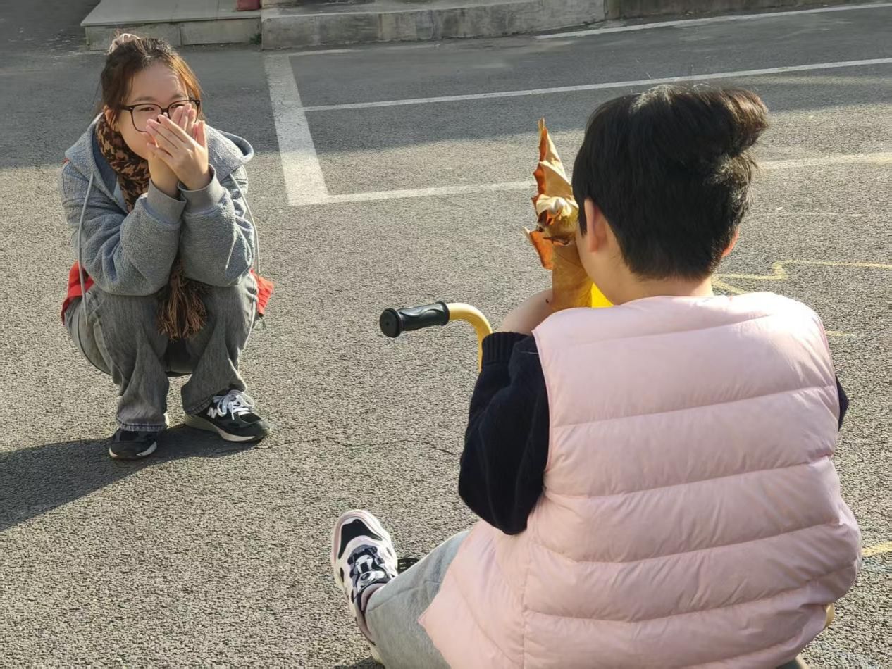 暖阳倾泻的活动场地,是童心与善意的栖息地。志愿者轻坐儿童小车,将孩子温柔拥入怀中,车轮轻转,清脆的笑声在暖阳下回荡;孩子掌心的落叶,是自然馈赠的礼物,在指尖翻飞间,漾开最纯粹的笑意。志愿者俯身屈膝,与执叶的孩子静静对视,眼底的柔光化作桥梁,轻轻走进“星星的世界”。风拂过发梢,叶影斑驳间,孩子的笑声似银铃般清脆,漫过时光,也漫进志愿者的心底。“哪怕只是并肩静握一片落叶,都觉得是在和他们的世界轻轻相连。” 志愿者吴琴的话语,恰是这场陪伴最动人的注脚。