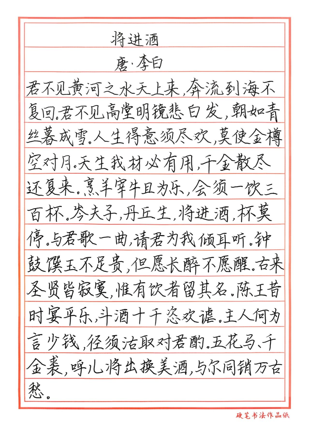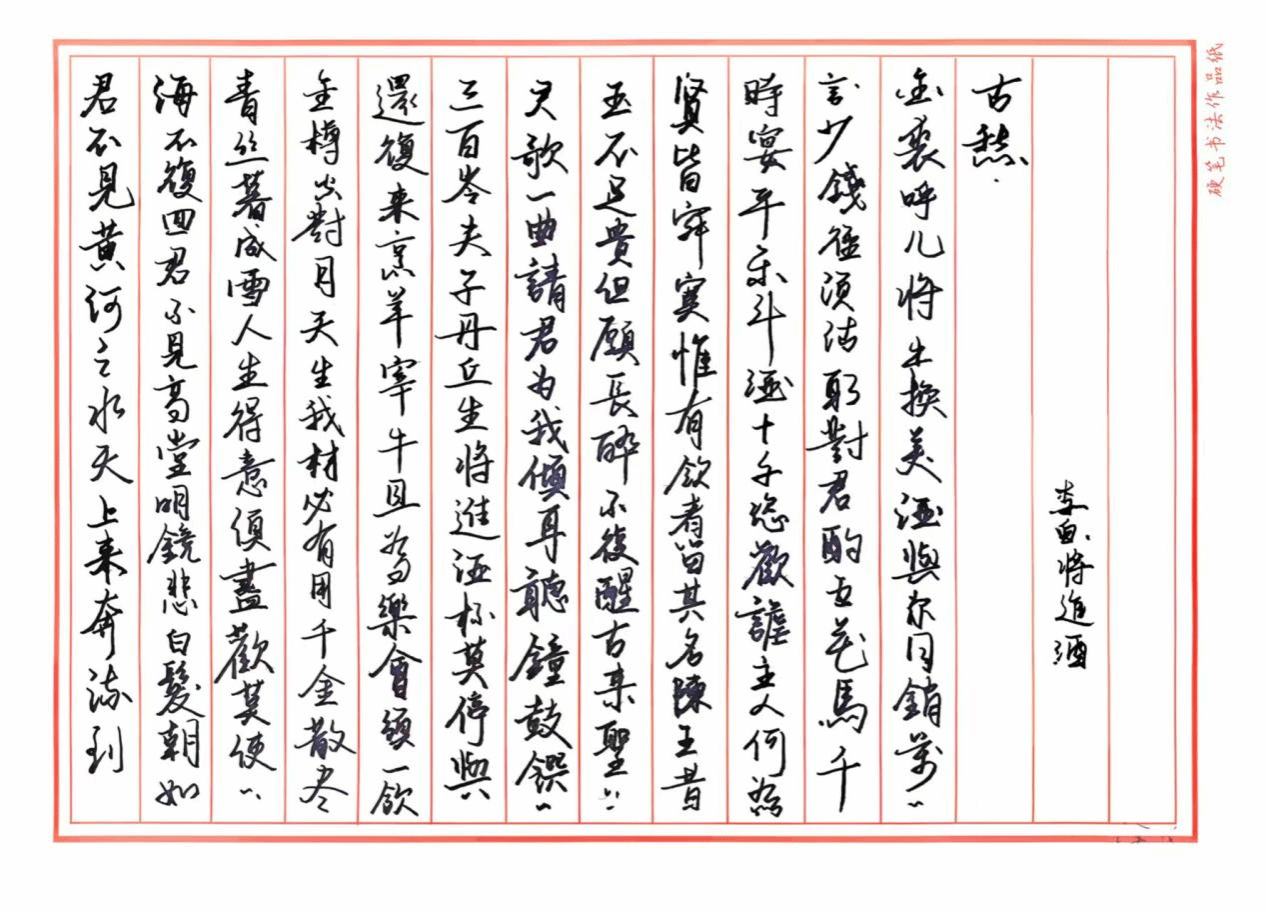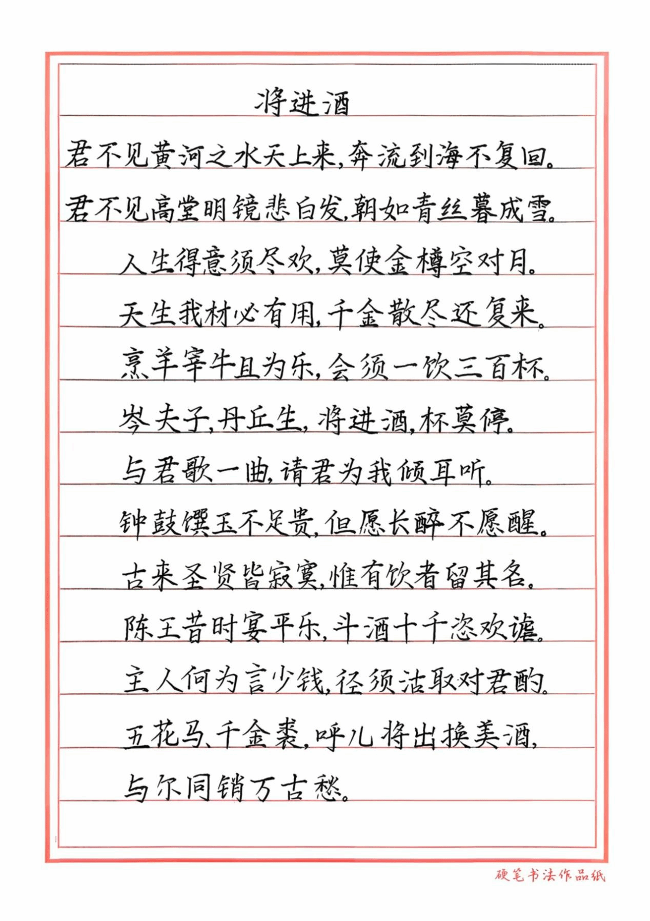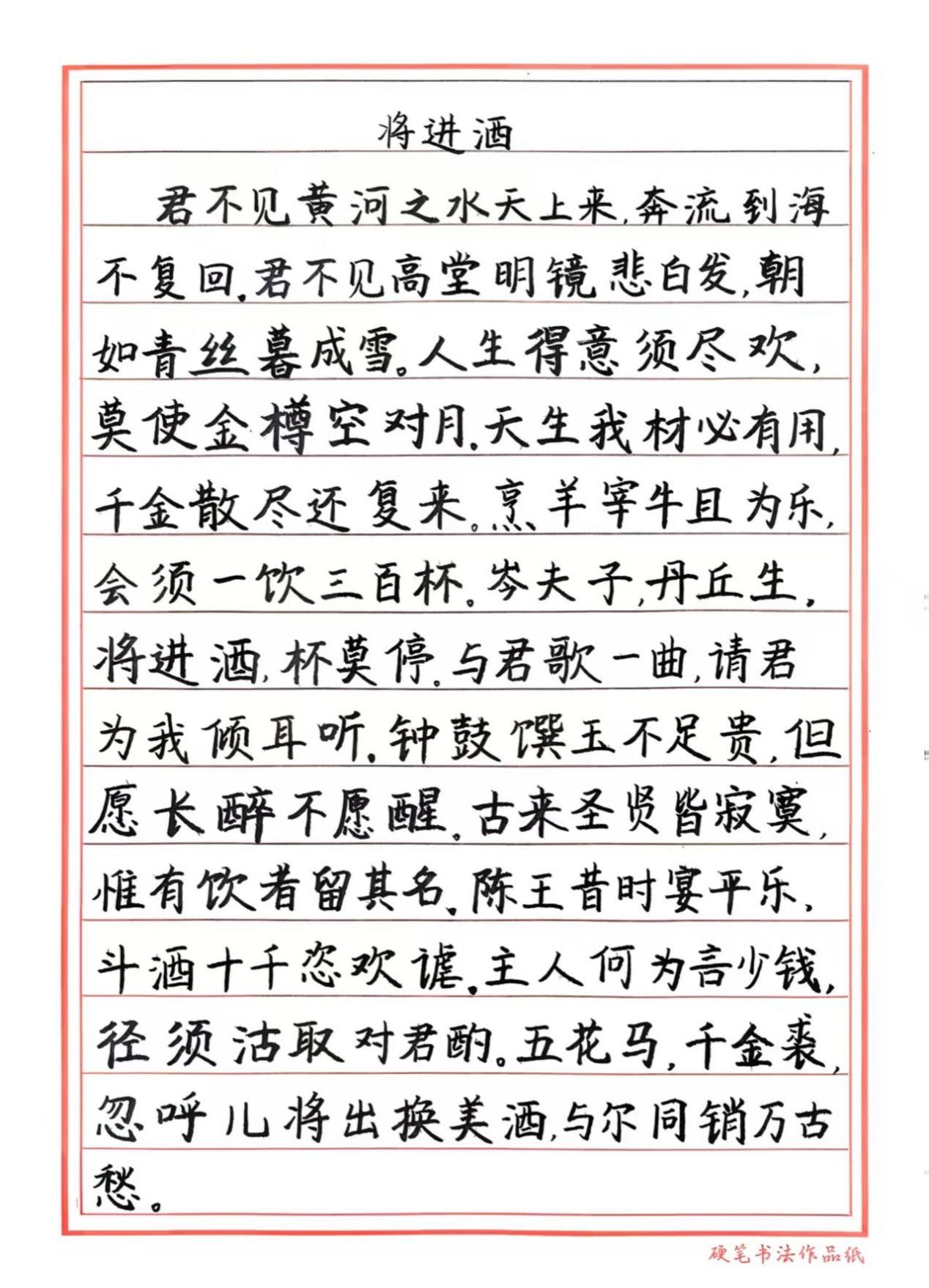 决赛现场,选手们统一使用指定纸张,在限定时间内书写完成经典诗作《将进酒》。现场参赛作品楷书工整端庄、行书潇洒流畅,尽显硬笔书法的独特韵味。最终由评委团根据笔法、结构、章法等维度进行专业赏析并打分。