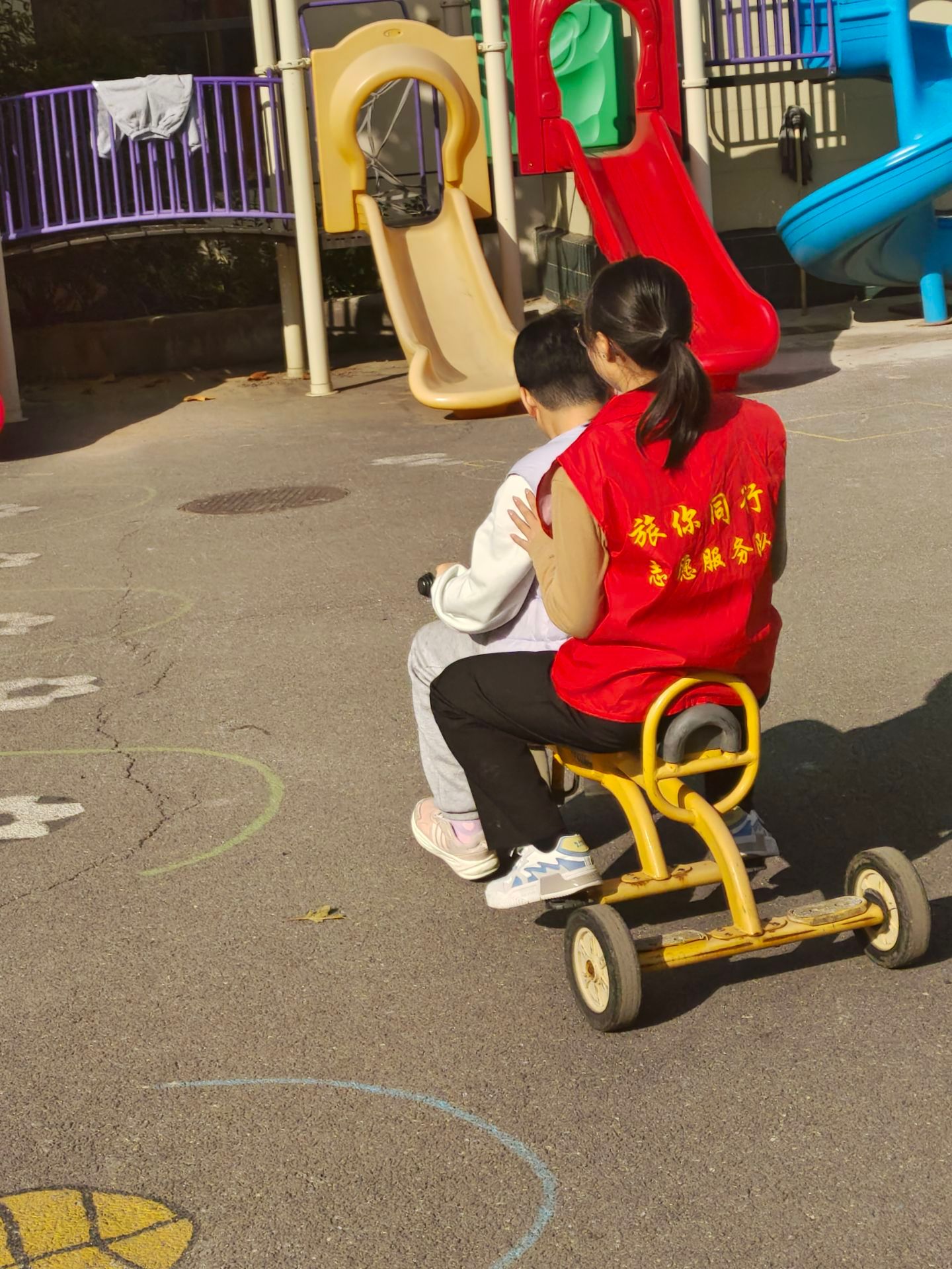 课堂之外,活动场地化作欢乐的海洋。志愿者们提前备好儿童小车,载着孩子们穿梭其间,清脆的笑声随风飘荡;彩虹伞下,大手牵小手奔跑、跳跃,色彩与身影交织成最动人的画面。“每个孩子都有自己的节奏,慢一点、多一点耐心,他们就会给你惊喜。”志愿者邸建颖始终陪伴在动作稍缓的孩子身边,用鼓励的眼神与温柔的话语,帮他们融入集体。阳光洒在孩子们纯真的笑脸上,运动不仅强健了体魄,更让他们在互动中学会分享与协作,感受到集体的温暖。