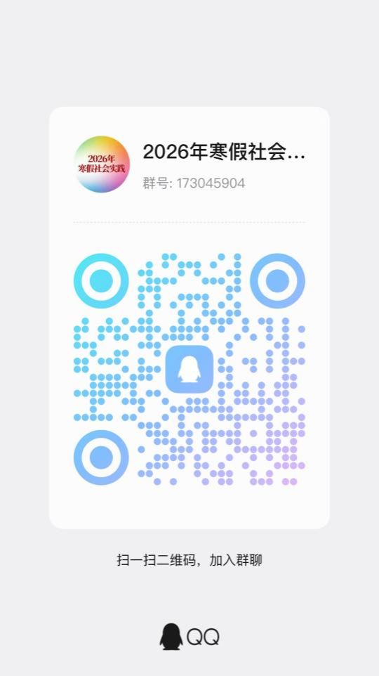 为方便大家交流咨询、组队协作,学院已搭建寒假社会实践专属QQ群(群号:173045904),群内将及时发布相关通知、解答疑问、共享资源。扫描下方二维码即可加入,让我们携手同行,共赴实践之约!